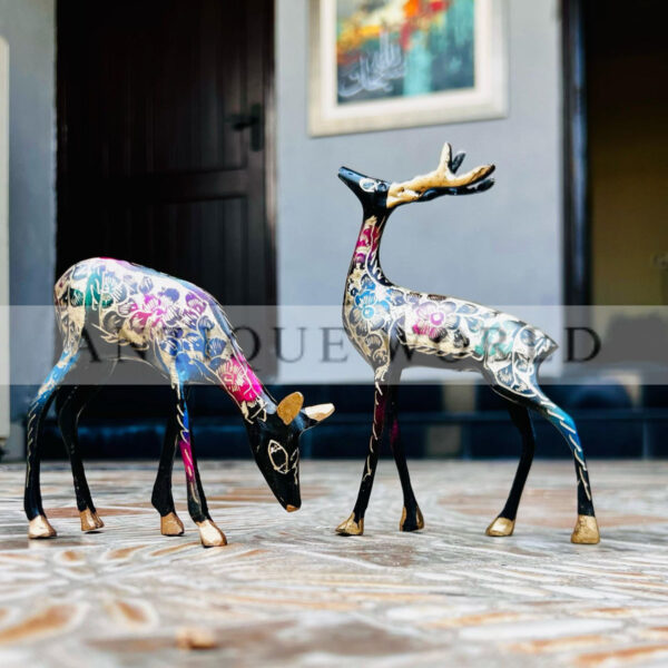 This is a Handcrafted Brass Deer Figurine Set, featuring intricate floral engravings with colorful enamel work. These elegant deer sculptures add a touch of sophistication to any decor, making them perfect for home, office, or as a unique gift. Let me know if you need a description!